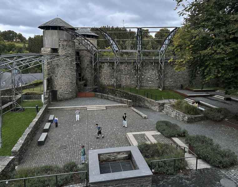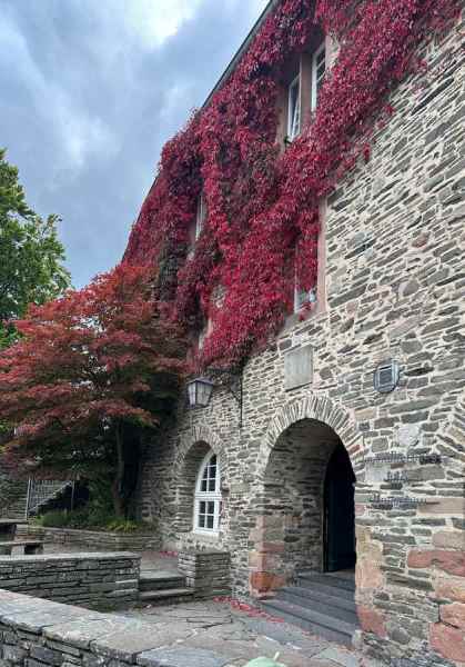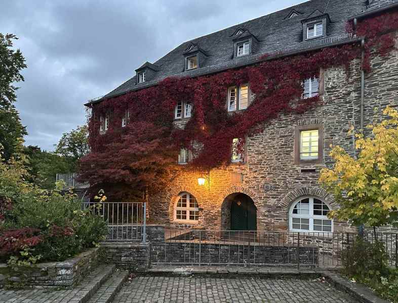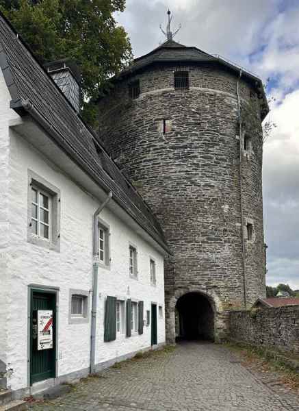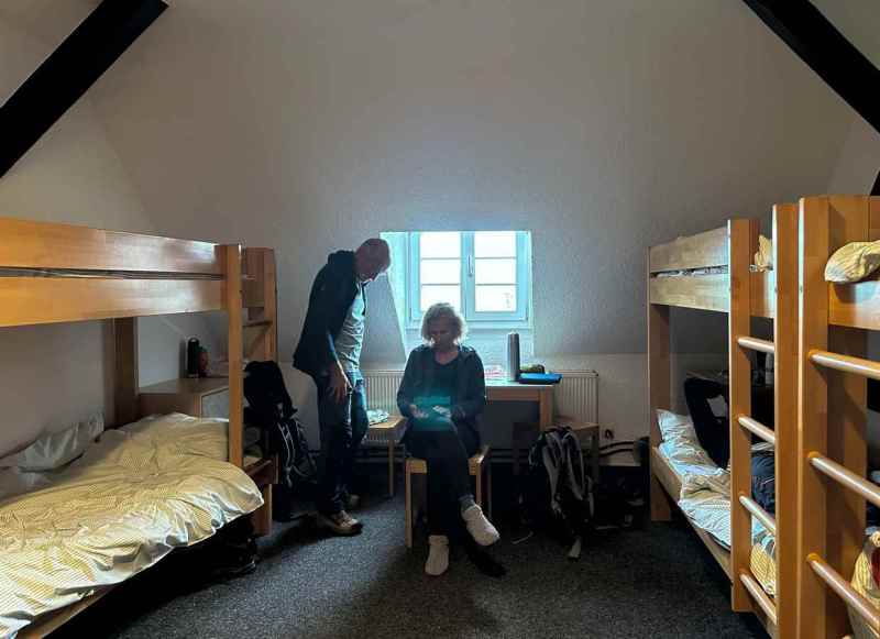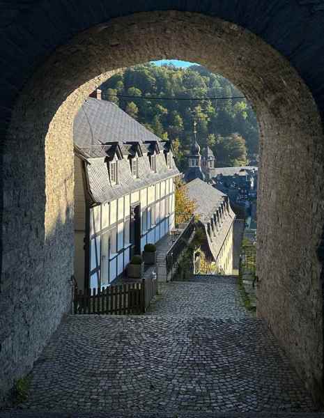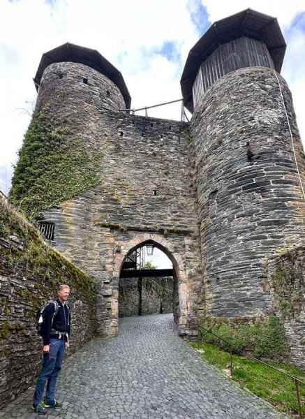Na de drink de trappen omhoog, een finale kuitenbijter van de dag naar de jeugdherberg, gelegen in het kasteel dat boven Monschau is gelegen. Probeer maar eens mensen eerst lekker verpozen op een terras en om dan weer een berg te bestijgen. Chapeau hikers….