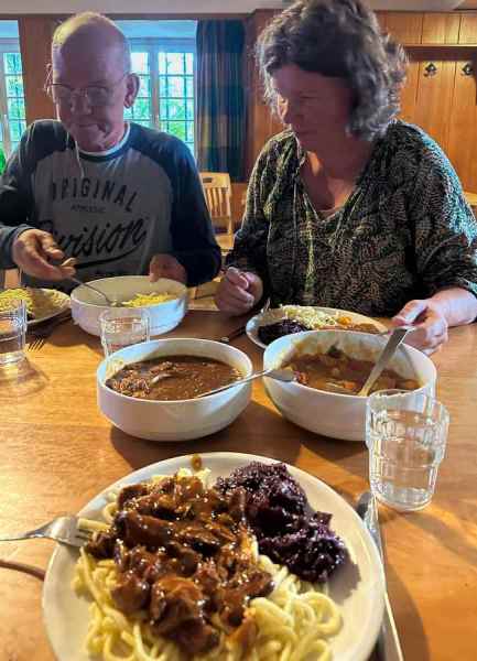Na een voedzaam diner (Spätzle mit rotkohl und Eintopf und vega gemüseeintopf) was er ruim tijd voor spelletjes ( o.a. Take Five en Torens bouwen). Om 2200h was het wel aftaaien naar de kamers boven in het kasteel voor een goede nachtrust ( 😉 ondanks snurkers en fluiters).