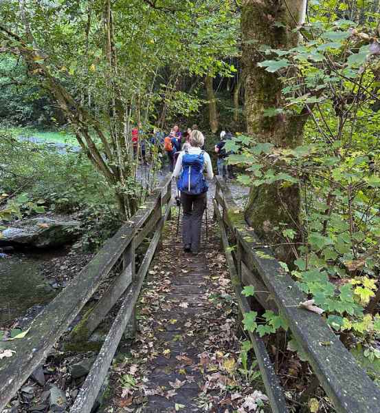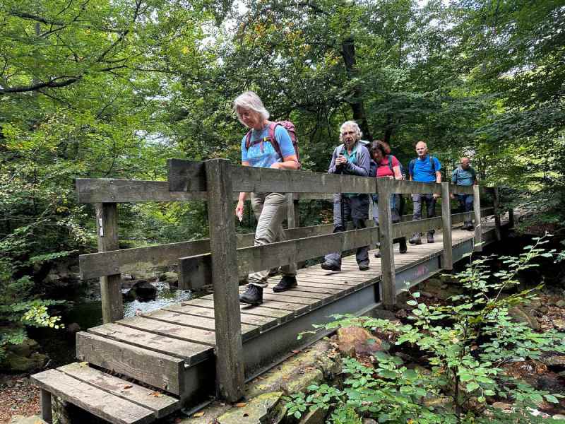 De terugweg ging via een geheel andere route dan heen op zaterdag. Eerst omlaag bewundren het mooie plaatsje Monschau met z’n vakwerkhuizen en gebouwen, over de nog kleine Ruhr en weer omhoog om warm te worden en het uitzicht. Hierna liet de wandeling een gevarieerd landschap zien.