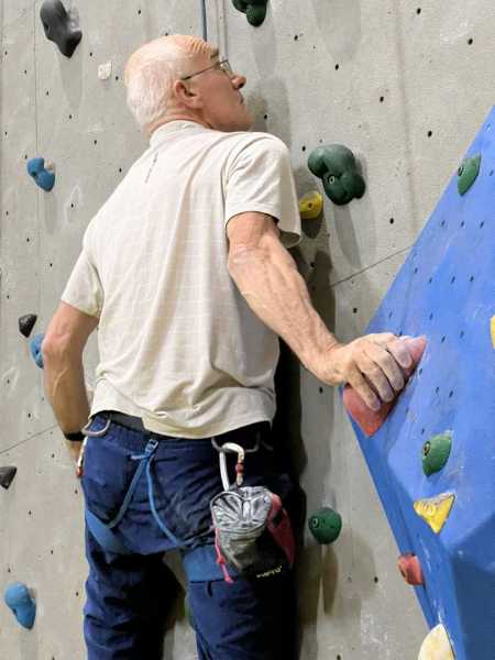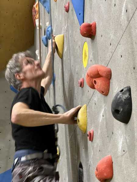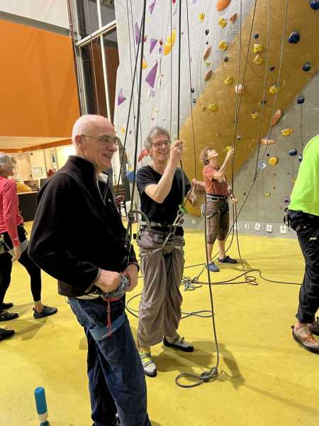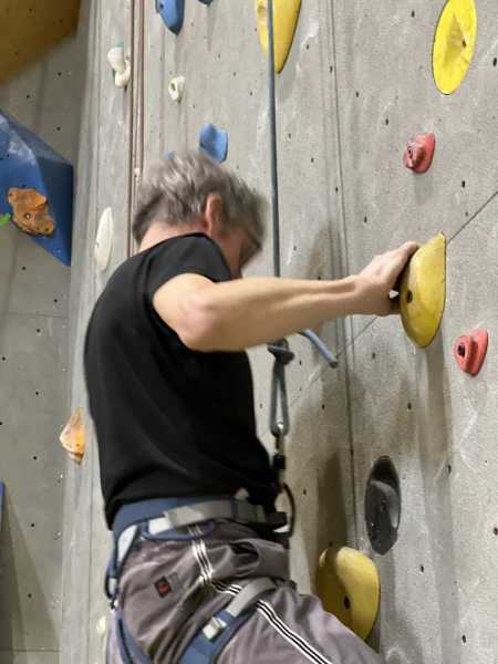 MarieLouise, klimmaatje van Rene, kon in de 6A doorklimmen (ongekend voor haarzelf) tot de 10de plaat waar ze Pieter klopte met een greep meer. Pieter die zelf helemaal door het dolle was omdat hij zover in de 6A gekomen was nam het sportief op, ziet ML het wedstrijd element stuwt ons tot grote hoogten.
