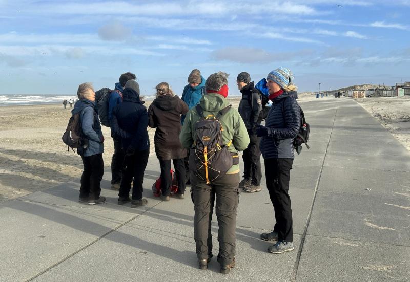 Al snel kwamen we langs wat restanten van de Atlantic Wall, in de vorm van bunkers onder het zand in de duinen. Daarna ging de wandeling 4 km over het strand met zicht op de Maasvlakte en later ook nog een restant van een bunker in zee. Hier op het strand was er ook een goede plek om met weinig wind een koffiepauze te houden.